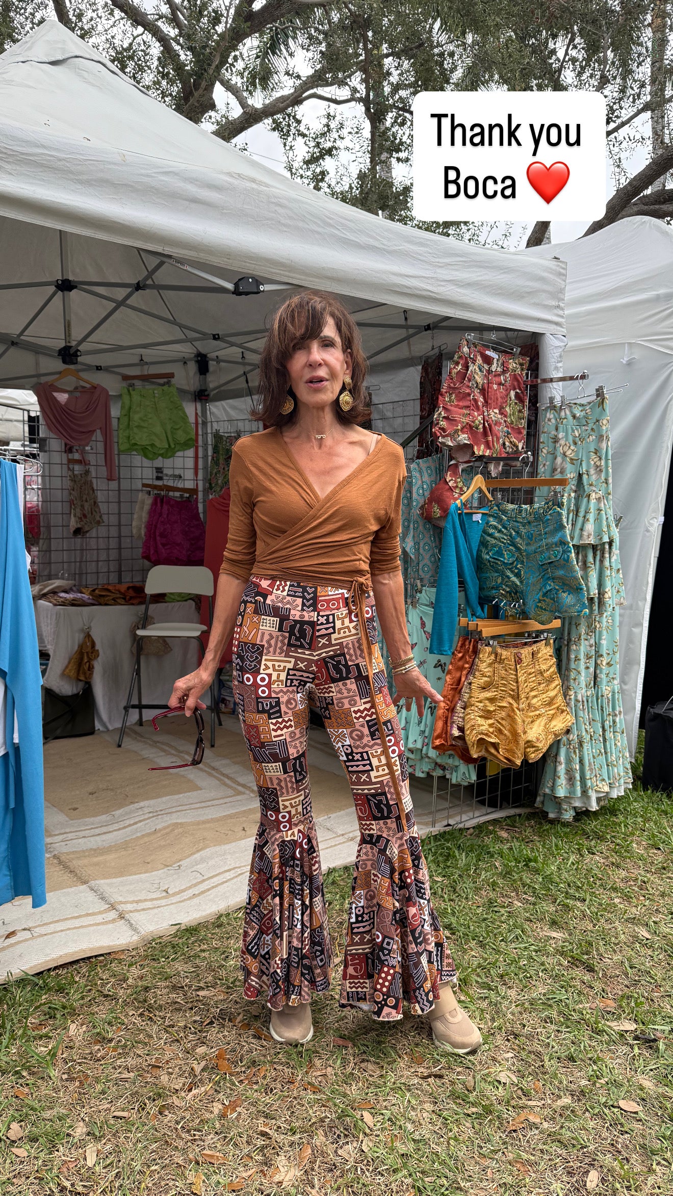 The beautiful Bracha Horowitz wearing the Daisy Bell Pants in Geo paired with the Jazz Wrap Sweater in Sand