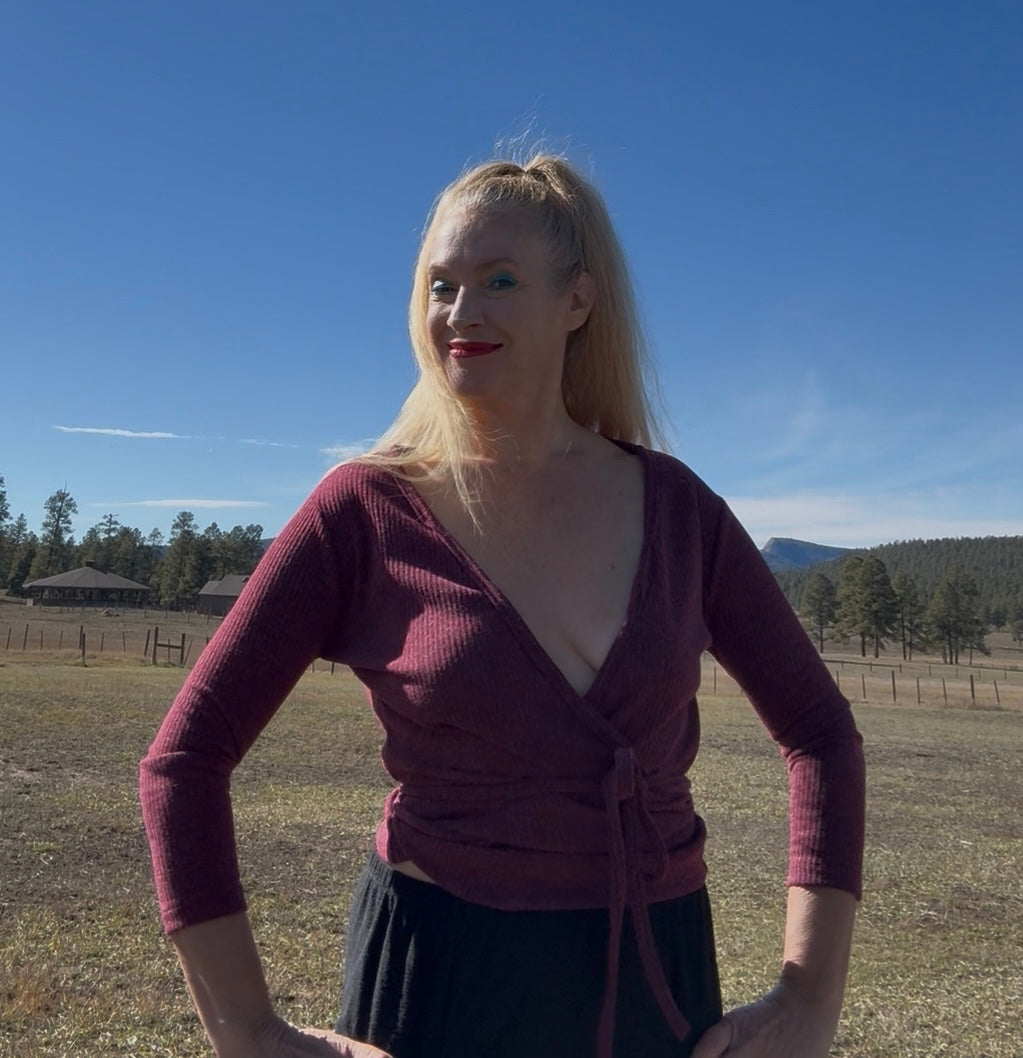 Step into a world of effortless elegance with this stunning one of a kind wrap sweater. Perfect for any occasion, this wrap combines comfort with eye-catching style, making it a must-have for your wardrobe. Jazz Wrap Sweater in Burgundy Rib Knit: it is one of a kind. This versatile wrap sweater is designed to accentuate your figure, with a wrap-around tie that allows you to adjust the fit to your preference. The deep V-neckline adds a touch of allure, while the soft, stretch fabric keeps you comfortable throughout the day. The cropped length pairs perfectly with the high-waisted Sandy Pants, creating a balanced, harmonious look. Together, the Sandy Pants and Jazz Wrap Sweater create a bold yet sophisticated outfit that is sure to turn heads. Embrace your inner free spirit with this effortlessly chic combination, perfect for showcasing your unique style.